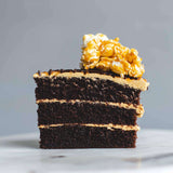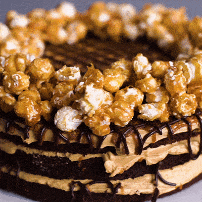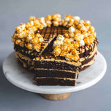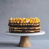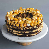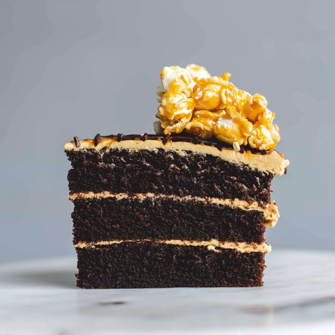 Moist chocolate cake sandwiched with salted caramel buttercream, topped with popcorn and just the ultimate drizzle of salted caramel and chocolate sauce, layering up has never been so mouthwateringly irresistible!