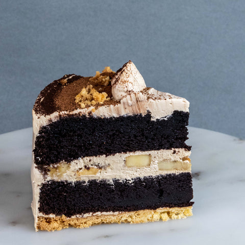 Moist chocolate cake with fresh bananas and toffee chantilly cream coated with coffee toffee buttercream. Dig into the decadent, the crunchiness of the cake base and the moist texture of the chocolate cake and banana will surprise your taste bud! Everyone will definitely fall in love with this cake.