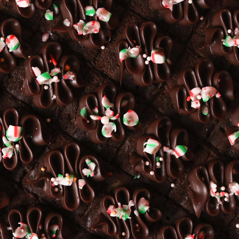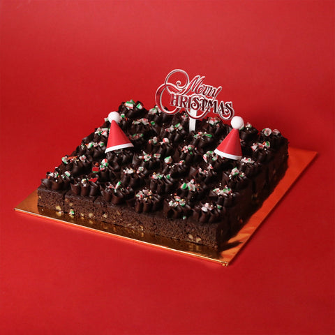 This holiday season, indulge in joy one bite at a time with our Christmas Chocolate Ganache Brownie Bites. Each piece is baked to fudgy perfection and topped with silky dark chocolate ganache, crushed candy canes, and adorable Santa hat decorations (while stock last) that instantly spark the Christmas spirit.