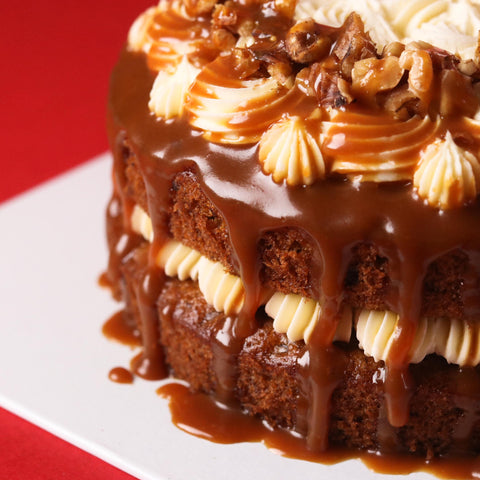 Bring the warmth of Christmas into every bite with our upgraded Carrot Walnut Cake, now dressed in a golden caramel drizzle and topped with a Merry Christmas topper. This festive masterpiece combines everything you love — moist carrot sponge made with freshly grated carrots, golden raisins, chopped pineapple, and crunchy walnuts, layered with thick cream cheese frosting that melts in your mouth.