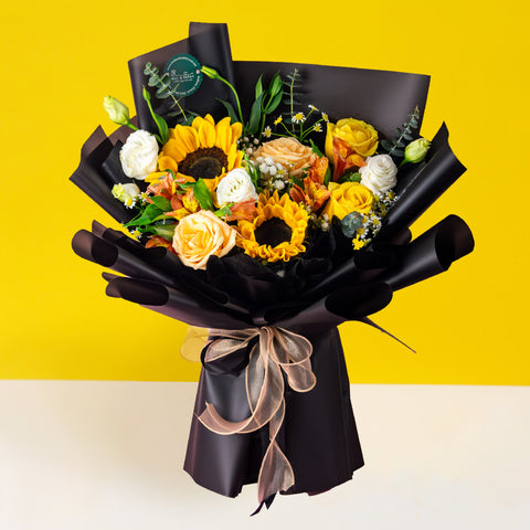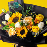 💐 2 stalks of sunflower, 5 stalks of yellow roses with eucalyptus leaves