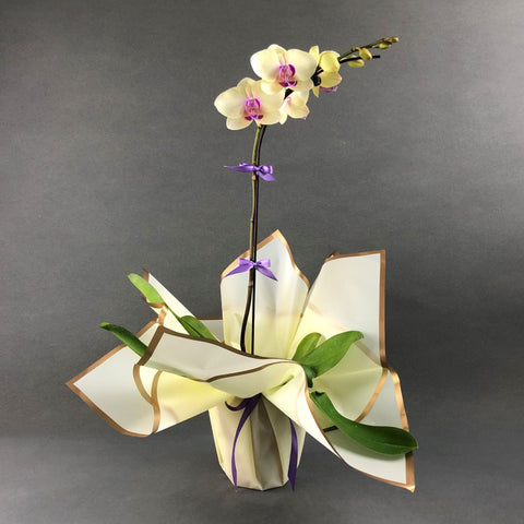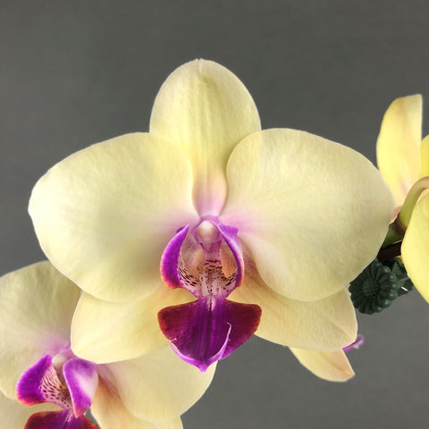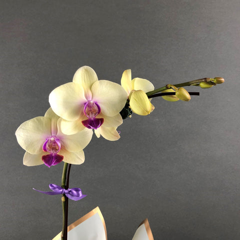 Light Yellow Phalaenopsis Orchids plants represent happiness, loyalty, friendship, and new beginnings. These light-yellow orchids with a mixture of light pink purple throats have at least 5 to 8 blooms per stem, and each bloom is 3 inches to 4 inches wide.