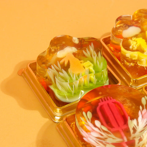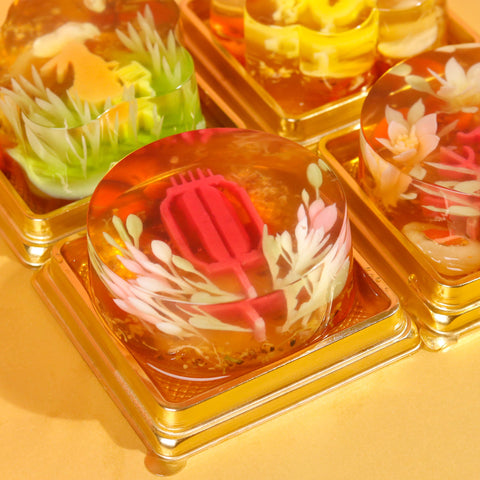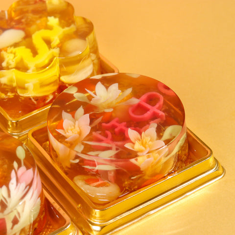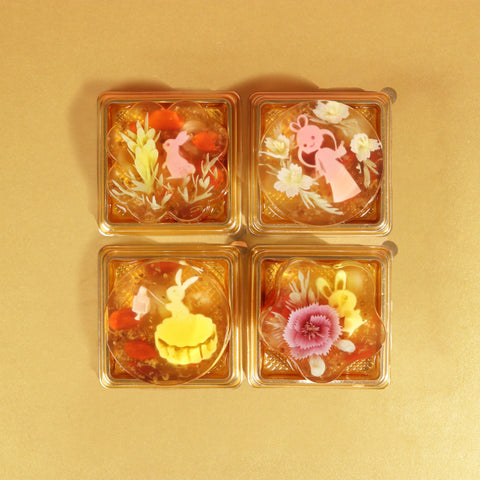 This assorted jelly mooncake features handcrafted 3D flower petals infused with Osmanthus tea, Goji Berry and Dried Longan flavour. It's visually stunning and delicious, making it perfect for gifts during this Mid-Autumn festival!