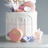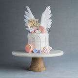 What could be better by gifting an angel wing cake for an angel lover in your life? This elegant cake is beautifully designed with an angel wing as the cake topper, covered in white vanilla frosting and filled with sweet treats such as macarons and chocolates all over the cake. There are 4 different cake base you can choose and this cake is suitable for any birthday party!
