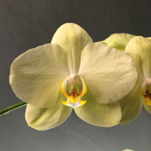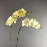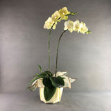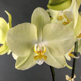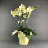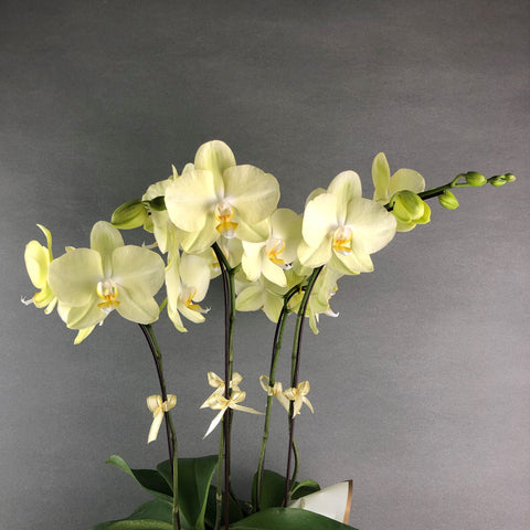 Lime Green Phalaenopsis Orchids plants represent happiness, loyalty, friendship, and new beginnings. These light-yellow orchids with a mixture of yellow and red throats have at least 4 to 6 blooms per stem, and each bloom is 3 inches to 4 inches wide.