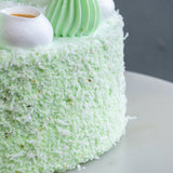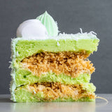 Soft and tender pandan sponge cake layered with Onde Onde filling (gula Melaka coconut), gula Melaka Chantilly cream. Made from scratch with most fresh ingredients, definitely suits everyone!