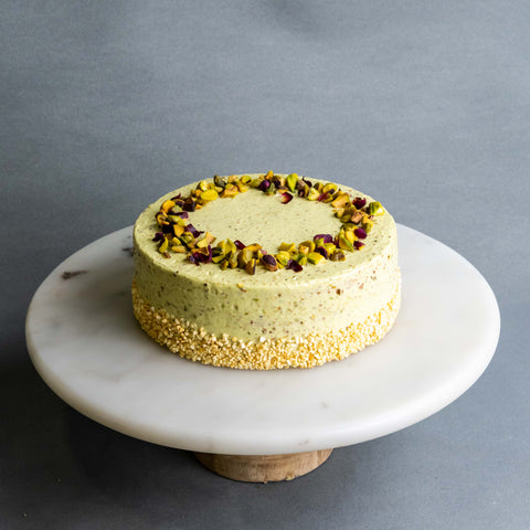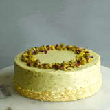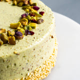 Soft and spongy vanilla cake layered with milk chocolate ganache, roasted pistachio and pistachio cream. It's rich and chocolaty but most definitely not too sweet, making it suitable to be enjoyed by the whole family! You will definitely love it even you're not a chocolate lover