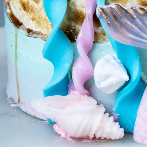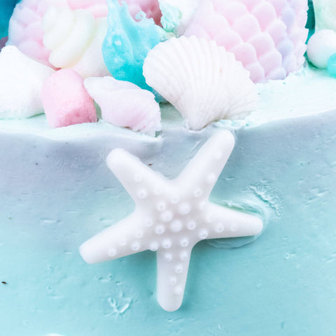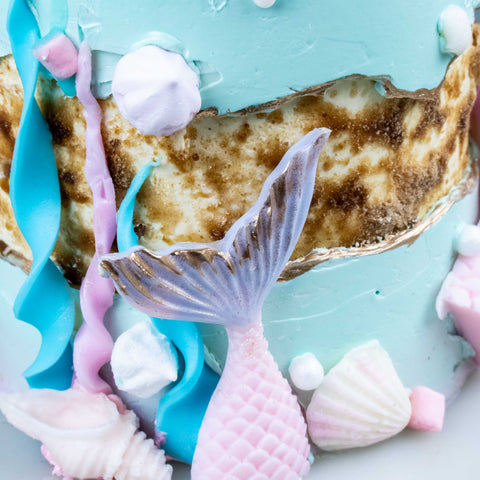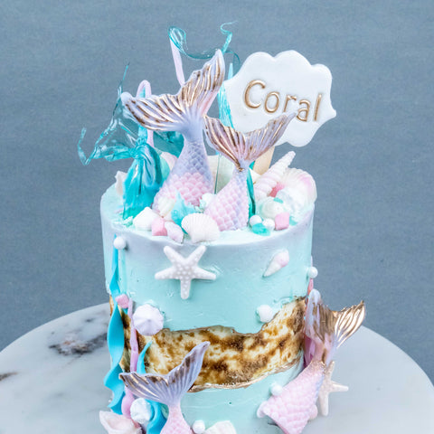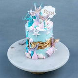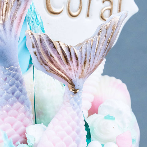 Mystical, magical and beautiful are just the same reason why we can't get enough of mermaids! Let your imagination take over and swim with the mermaids in the ocean. This cake comes with your very own customized name topper.